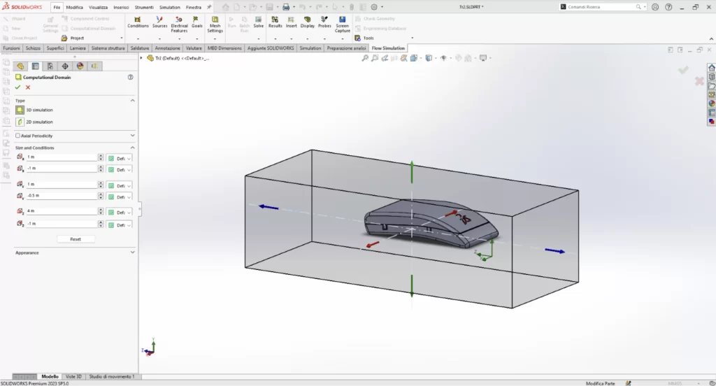 Nel configurare manualmente il dominio computazionale, è importante evitare di ridurre eccessivamente la zona circostante il baule, al fine di studiare accuratamente la dinamica del flusso. Le opzioni di configurazione del dominio computazionale sono varie: è possibile impostare simmetrie nel dominio, riducendo la complessità dello studio, o optare per studi 2D, trattando il dominio come un semplice foglio per analizzare il comportamento del fluido in una specifica sezione.
