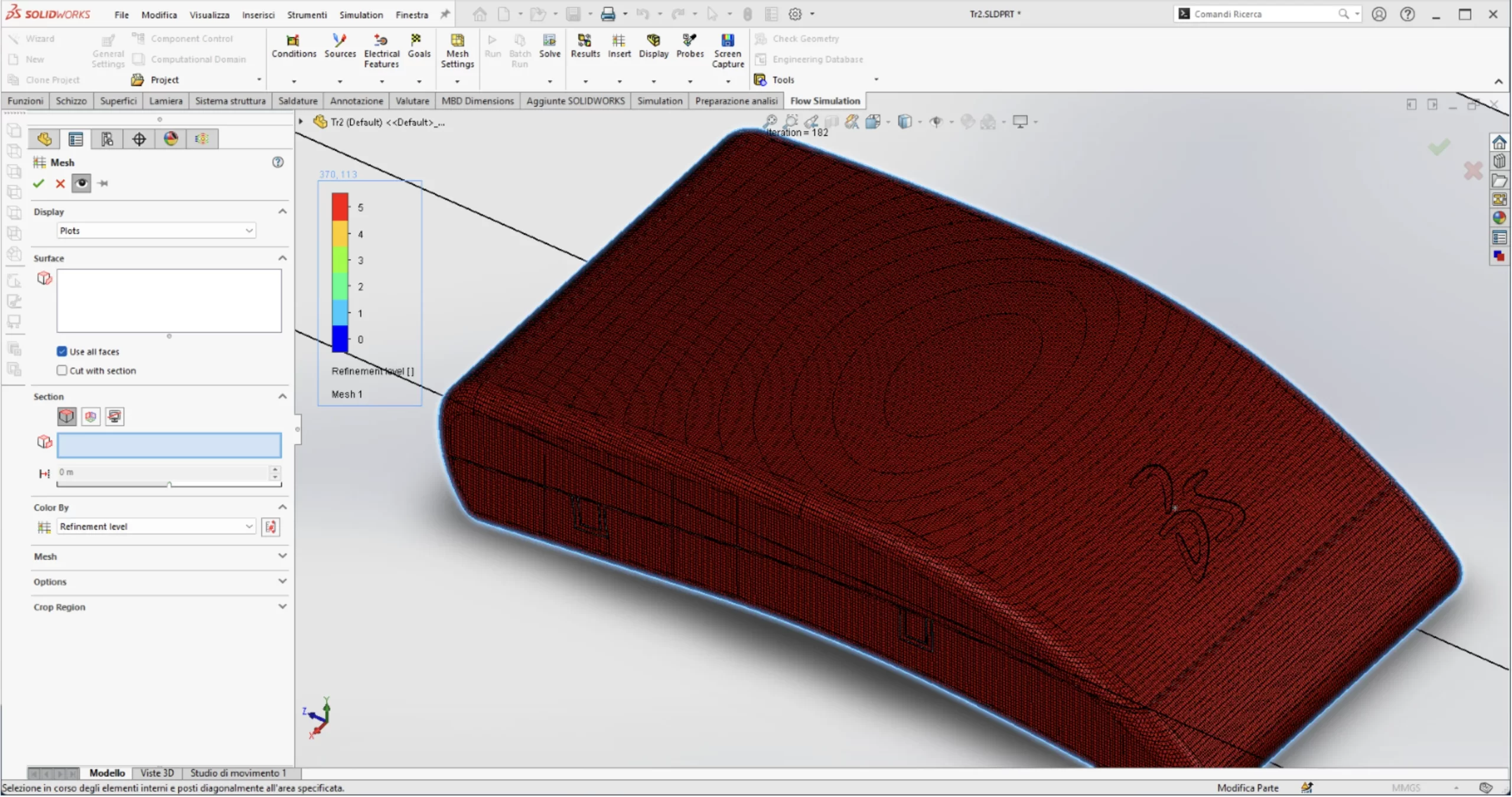 Nel nostro caso, partiamo da una mesh con impostazioni globali automatiche al livello 1 e applichiamo un raffinamento locale della mesh di tipo equidistante fino al livello 5 sui due corpi che costituiscono il baule. Questo ci consente di ottenere una mesh sufficientemente fitta attorno alla forma da analizzare, garantendo una risoluzione accurata delle caratteristiche aerodinamiche.