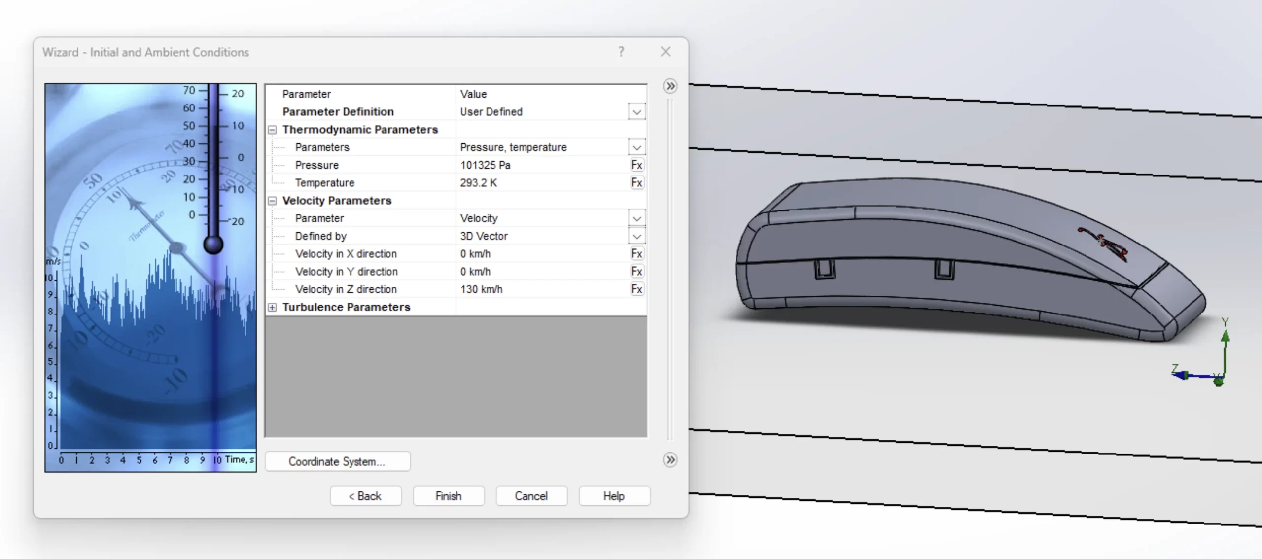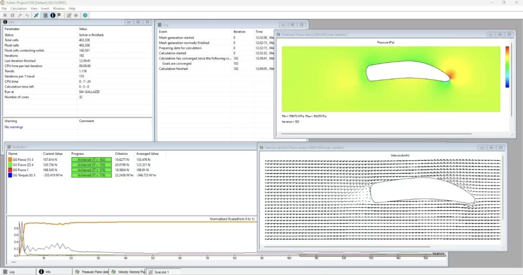 Durante la configurazione dell’analisi, tramite il Wizard, abbiamo definito le condizioni al contorno del nostro studio, come ad esempio la velocità dell’aria a 130 km/h e la pressione atmosferica a 101325 Pa. È possibile aggiungere ulteriori condizioni al contorno, come temperature di parete o flussi in ingresso o uscita da superfici specifiche, se necessario. Il sistema tiene conto di queste impostazioni e, tramite un algoritmo interno, monitora le principali grandezze per comprendere l’evoluzione del calcolo e determinare quando è stata raggiunta una soluzione soddisfacente.