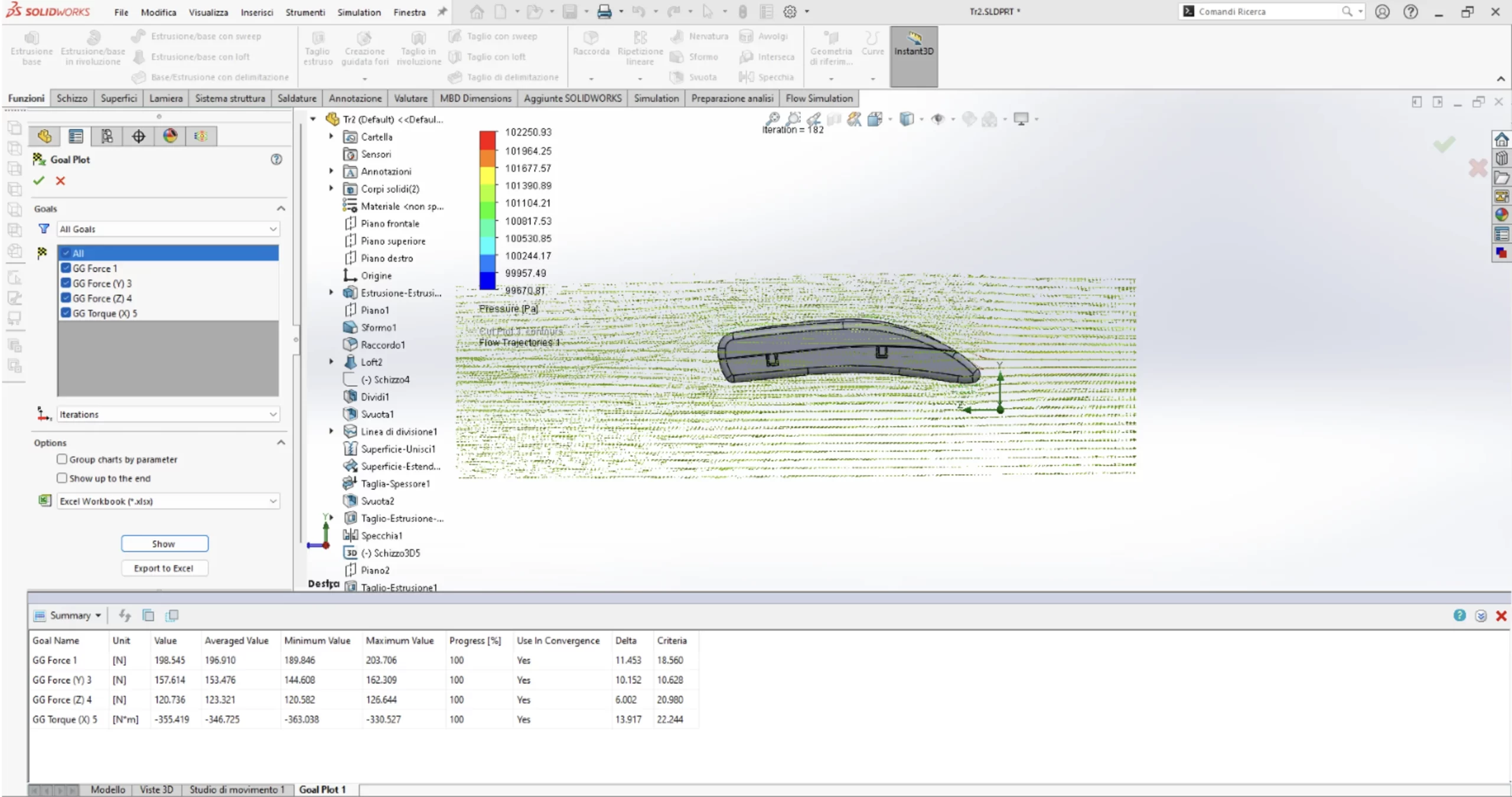 Infine, attraverso il grafico “Goal Plot”, possiamo analizzare la forza di resistenza all’avanzamento (Force Z) e quella verticale (Force Y), così come la coppia rotazionale attorno all’asse X. (Fig. 11) Questi dati forniscono informazioni cruciali sulle prestazioni aerodinamiche del modello e possono essere utilizzati per ottimizzarne il design.