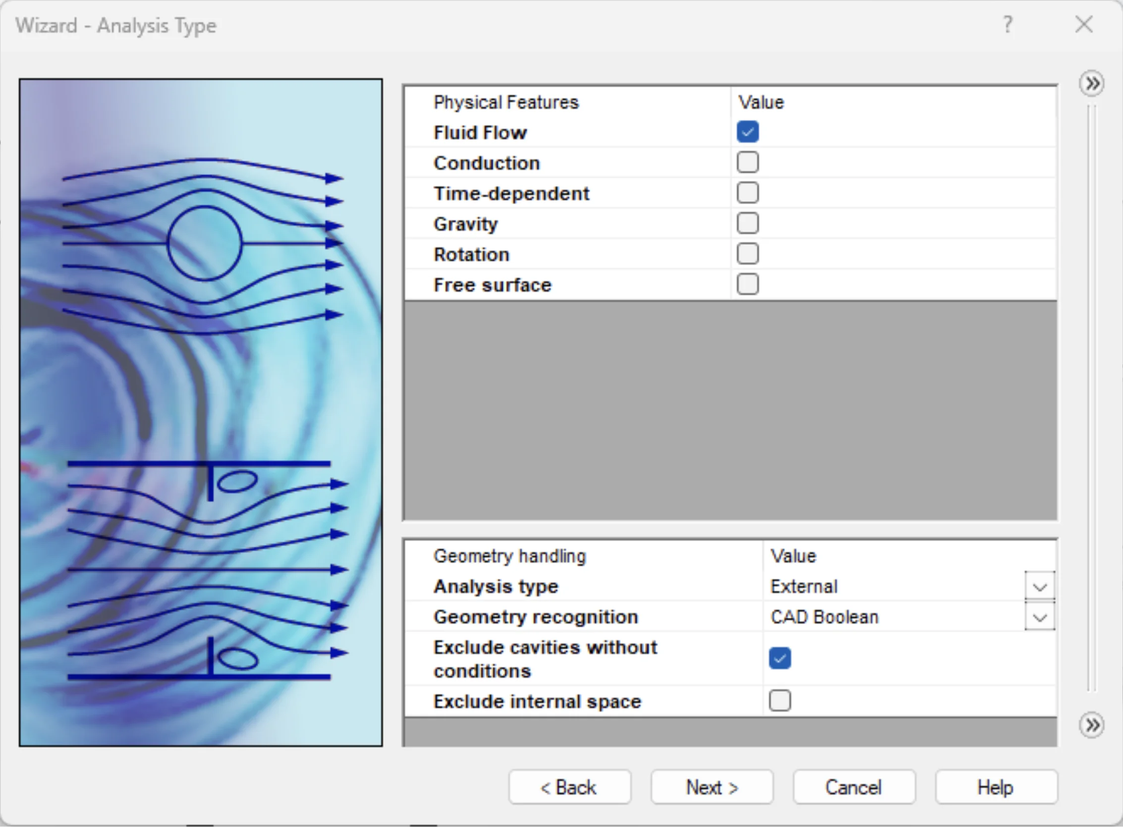 Procedendo, possiamo selezionare gli effetti fisici da includere nell’analisi, come il tipo di studio (interno/esterno), lo scambio termico, la modalità di esecuzione (a regime/in transitorio), gli effetti della gravità, la presenza di regioni in rotazione e l’eventuale studio con fluidi immiscibili. (fig. 3)